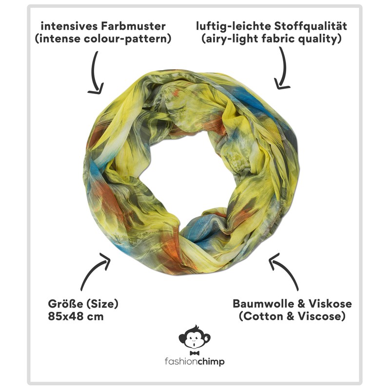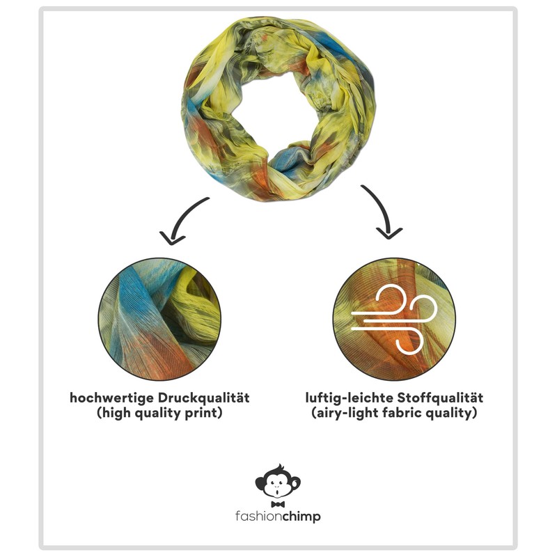 The smooth-flowing, colourful summer loop impresses with its skin-friendly material mix with effective, magical feather all-over print.