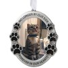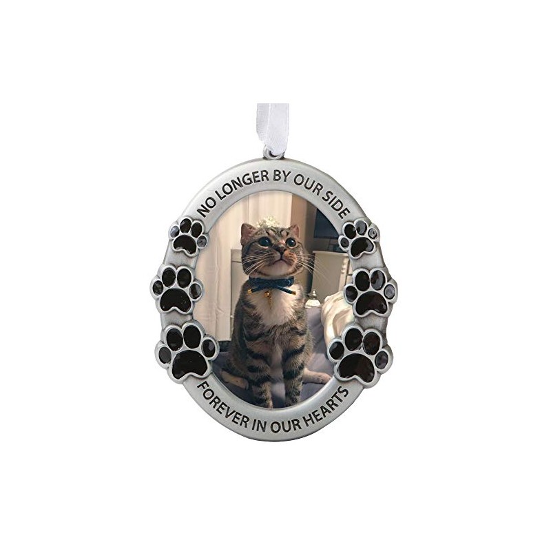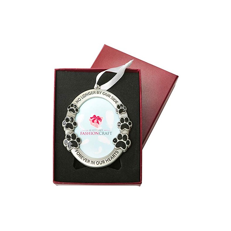 • PET MEMORIAL ORNAMENT. This little photo frame is made to remember our departed beloved pets. designed with beautiful black paw prints and words, "No Longer By Our Side" and "Forever In Our Hearts", nicely colored with pewter gray. Remember his/her contagious big smile that made you smile too through a photo.