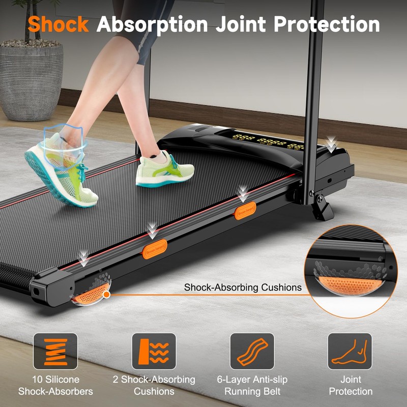 • 【Safety Focused & Comfortable Cushioning】: Exercise with confidence using the emergency stop safety lock (included) and the double-layer running deck with silicone shock absorption (36.6" x 15.7" belt). This treadmill for home prioritizes your safety and joint comfort, making it reliable workout equipment for daily fitness routines as a walking pad under desk or standalone unit.