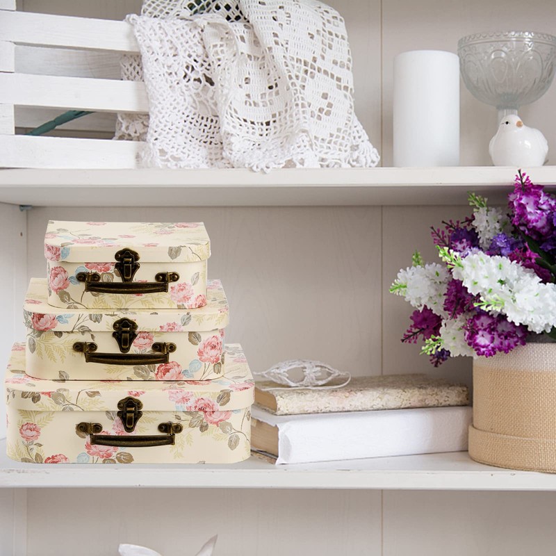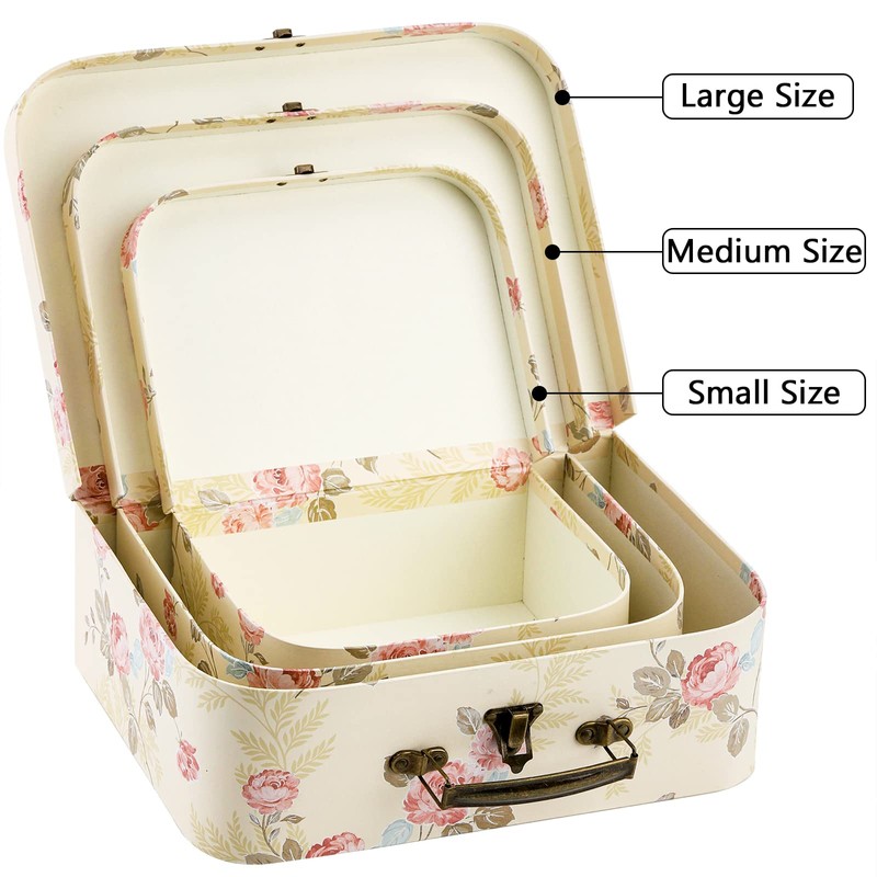 • Package Included: 3Pcs Storage Box Decorative Storage Boxes Storage Gift Boxes With Lids Storage Boxes. The suitcase set includes small, medium, and large sizes; the small measures: 7.9 x 6.2 x 3.1 inches; medium: 9.8 x7.4 x 3.4 inches; large: 11.8 x 8.6 x 3.7 inches