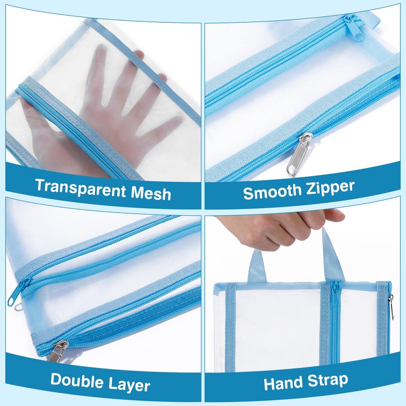 Fassave 6 Pack Mesh Zipper Pouch Bags, Double Layer Nylon Pouch with Handle for Office Travel Organization (Black, A4)