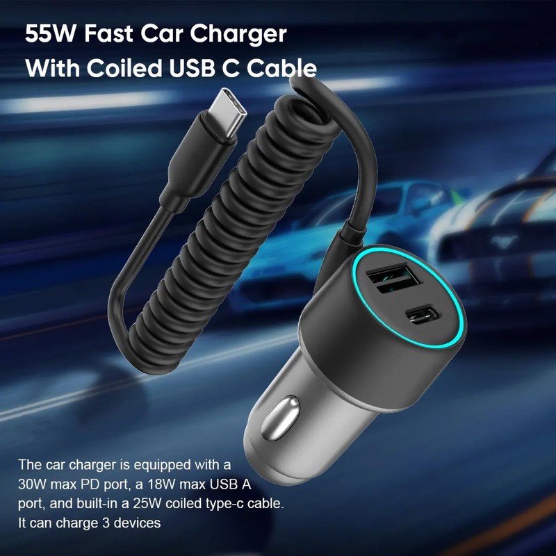 • ❰THREE DEVICE FAST 55 WATT CHARGING❱: Full 55W USB Type-C Cable Compatible Vehicle Car Carger, Supports fast charging Compatible with Apple MacBook Pro 2025/2024/2023/M1/13"/14"/16"! Perfect for travel or car; 12Volt universal power with compact design make it easy carry and store in backpack or suitcase for travel.