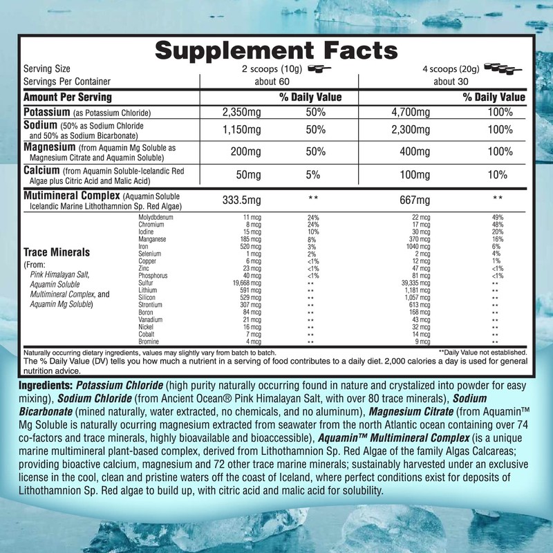 - Fasting supplement powder with 4700mg Potassium, 2300 Sodium, 400mg Magnesium, 100mg Calcium, and over 74 trace minerals and co-factors