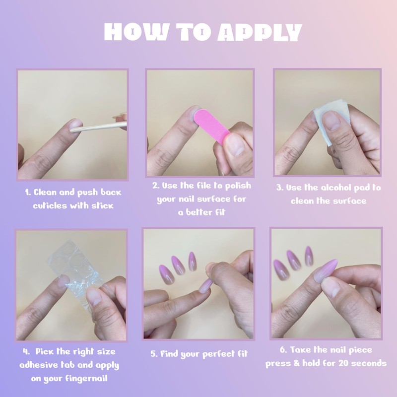 - 24 nails in 12 sizes: A range of nail sizes provides a perfect custom fit, with extra included just in case! Each set includes a storage box, adhesive tabs, a double-sided nail file, a cuticle stick, and an alcohol pad for easy application.