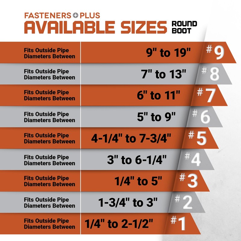- Base Width: 9-1/4" | Pipe OD: 3" - 6-1/4" | Max temp continuous: 212 F | Max temp Intermittent: 275 F | Shape: Round | Material: EPDM | Color: Gray