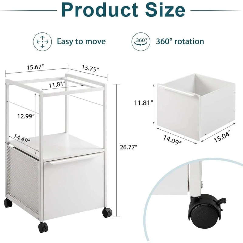 The White Metal Wood Rolling File Cabinet with Open File Hanging Bar is designed with an open space for hanging letter size documents. The open space is 12. 99 inches high, and the bottom space is retained after hanging documents to avoid bending them, and can also be used for books papers or other office supplies. Under your desk, next to your desk, tucked in a corner, or wherever makes sense for you. With a height of 26.77", it fits nicely into low clearance spaces. Four 360° casters and one support caster are included. Once you locate it in the sweet spot, simply lock the front 2 casters to keep it securely in place. 15.75" W x 15.75" D x 26.77" H. Designed to fit underneath or beside desks and no matter what scenario you intend to apply it to, you will surely be surprised to find that the size won't bother you. High-quality particle board with metal frame provides strong support for storage and is easy to assemble with detailed instructions, making it easy for you to have a complete filing cabinet.