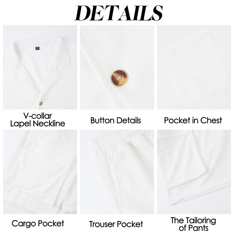 - Top: Suit lapel collar, Full open button, casual style,warmth-sealing ribbed cuffs and hem.Shorts: delicate waist elastic design with internal drawstring for easy adjustment.Sides Overalls three-dimensional pockets, convenient to bring small things.