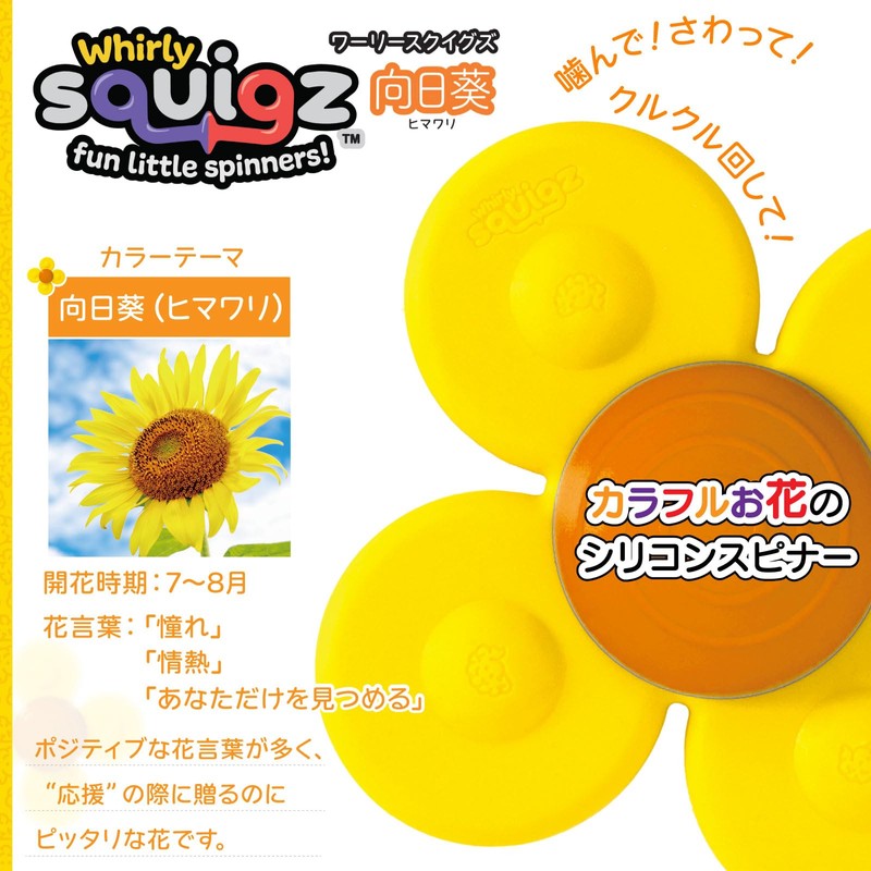 - Introducing the flower series from the "Whirly Squigz" baby toy from the educational toy manufacturer Fat Brain Toys, from the United States. 3 cute types: Camellia, Sumire, Sunaoi Himawari. The flower series with the color of the "flower" motif, has the characteristics of flower languages and flowers, so it can also be used as a gift to convey your child's thoughts