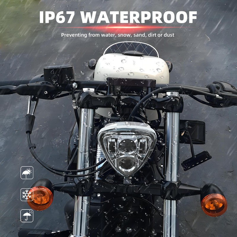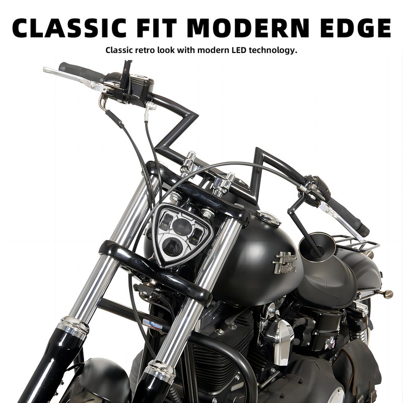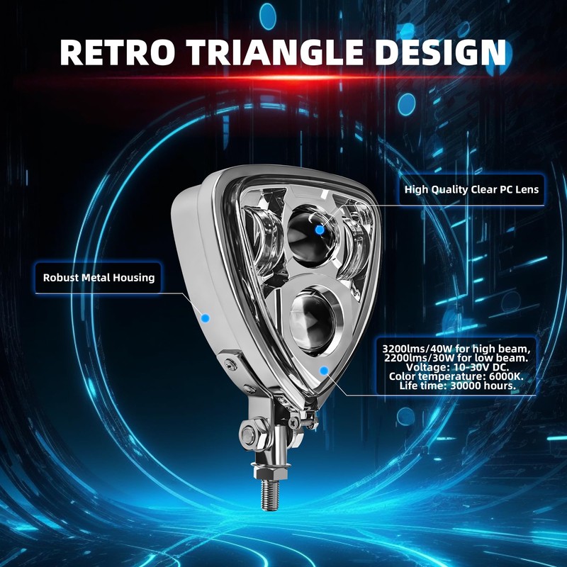 - Nice Exterior: Metal housing & Clear PC lens, enhance the look of your motorcycle with these retro custom triangle headlight. The LED headlight is water and dust resistant and suitable for all weather conditions.