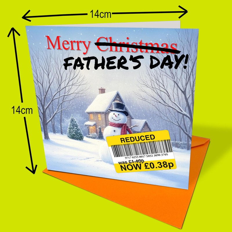 - Fun and Irreverent Design: Featuring the "Reduced Christmas Card" design with "Christmas" crossed out and "Father's Day" written in pen, this card is perfect for dads who love a good laugh.