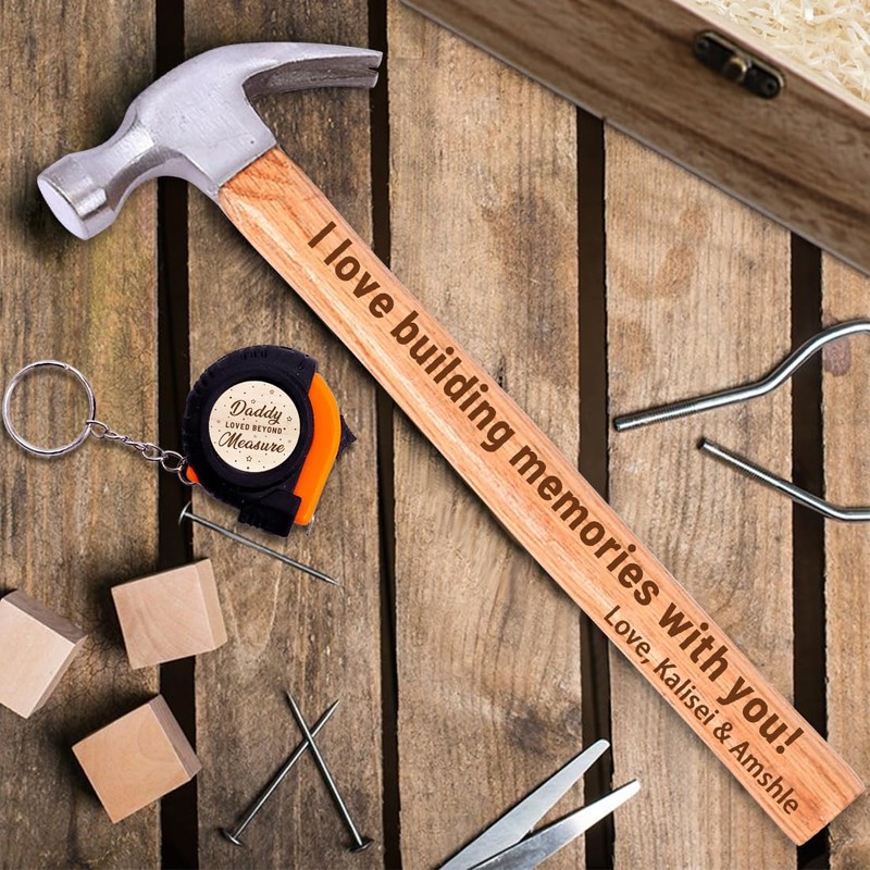 Fathers Day Hammer Set Gift,Engraved Wood Handle Hammer & Mini Tape Measure Keychain Set with Wooden Gift Box for Dad Husband,I Love You Building Memories With You.