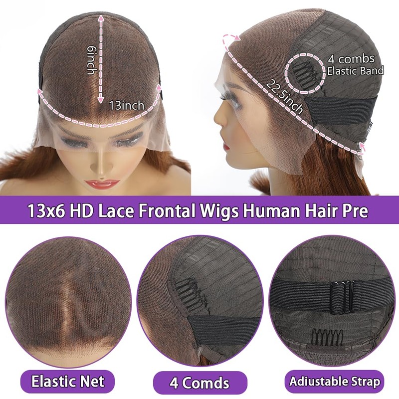 - 【Brown BOB Lace Front Wig Cap Size】:22.5 Inch Medium Cap With 4 Combs And Adjustable Straps.Firm And Snug.Fits Most People's Head Well.Glueless Wig ,The Extra Wig Elastic Bands Helps Making This Wig In Place Without Using Wig Glue And Allows To Change The Tightness To Fit Your Head Circumference,Comfortable Fit And Install