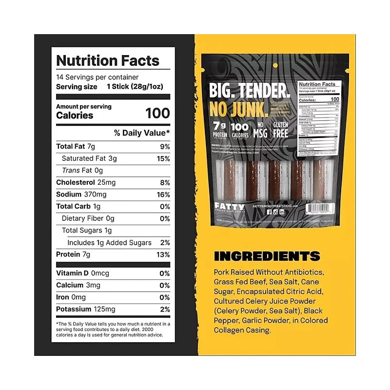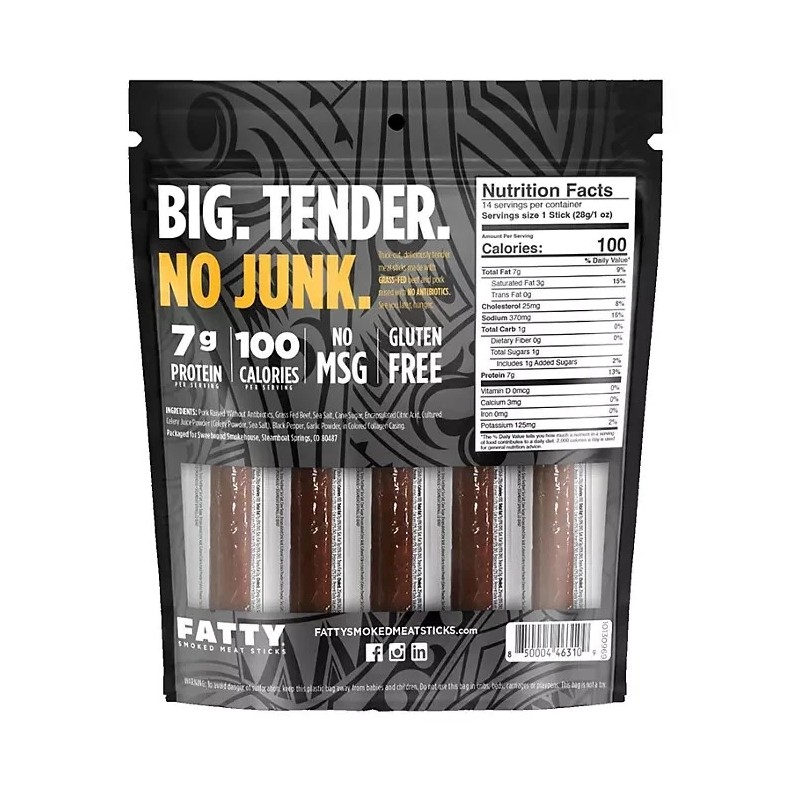 When we say FATTY stick, we mean it. We're not just playing around with a fun name - we're making a promise of a meaty, satisfying snack that won't leave you hunting for more. Our sticks are all about size and flavor, with no compromises. Each bite is packed with the delicious taste of premium grass-fed beef, enhanced by an exquisite blend of all-natural seasonings.