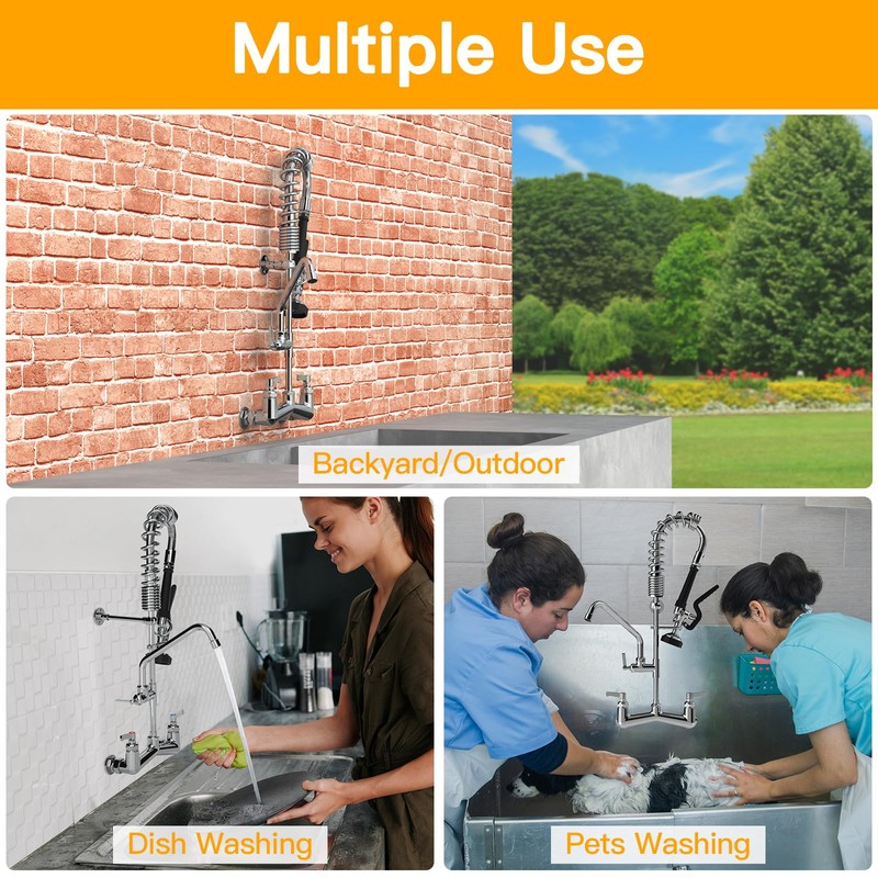 - 【10" swivel spout and 1.42GPM pre rinse sprayer】 This commercial sink faucet faucet comes with 10" spout. It can be 360°rotation to clean every corner of the sink.This pre rinse sprayer provides 1.42 GPM high pressure when the handle is pressed down.It efficiently rinses the sauce and the residue of food from the dishes before load them into a dishwasher.
