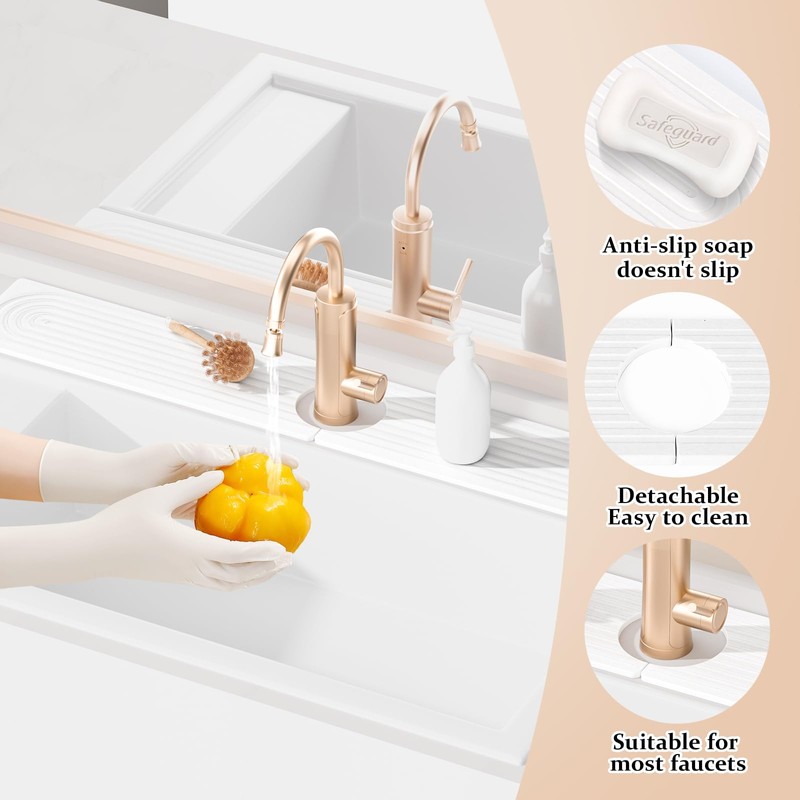 - Neat countertop: The faucet mat on the kitchen counter can accommodate dishwashing sponges and soap. The bathroom faucet mat can also hold toothbrushes, hand sanitizer, and cups. Make your bathroom and kitchen tidy and orderly.