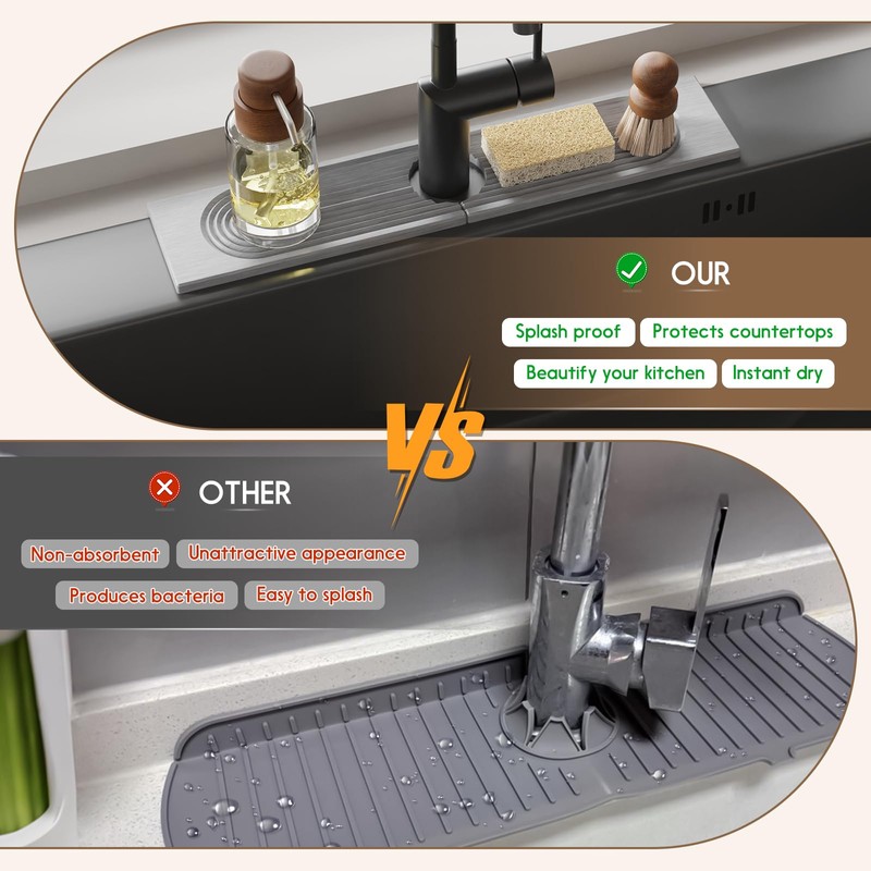 - Neat countertop: The faucet mat on the kitchen counter can accommodate dishwashing sponges and soap. The bathroom faucet mat can also hold toothbrushes, hand sanitizer, and cups. Make your bathroom and kitchen tidy and orderly.