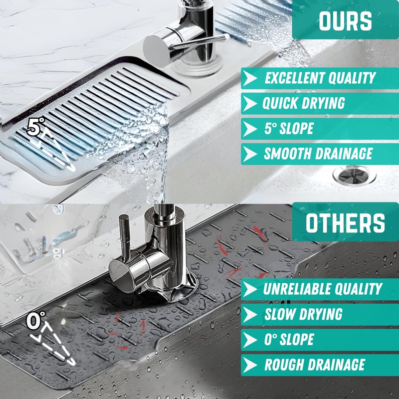 - SLOPE DESIGN - Our splash guard features a slope design for optimal water discharge, ensuring no puddles or water spots around the faucet, keeping your countertop dry and clean effortlessly. The integrated garbage disposal splash guard further prevents water splashes, maintaining cleanliness throughout your sink area.