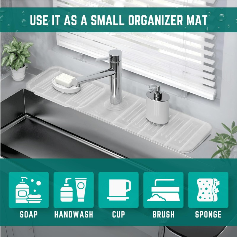 - VERSATILE FUNCTIONALITY - Beyond a faucet mat, it doubles as a sponge holder, dish soap tray, and kitchen organizer, offering ample space for various kitchen essentials to enhance organization and cleanliness. Additionally, it includes a garbage disposal splash guard as a small finishing touch, providing comprehensive protection around the draining area.