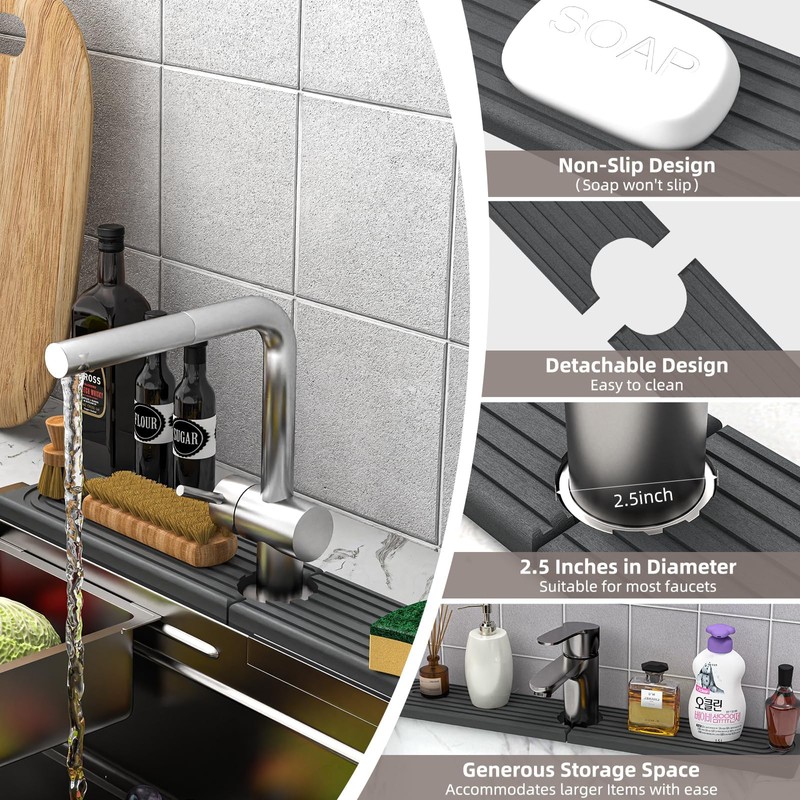 - 【Sink Mat & Organizer】 This Mat Not Only Absorbs Water From Around The Faucet, But Also Holds Soap, Toothbrushes, Cups, And Dish Sponges, Among Other Items That Need To Be Dried. Say Goodbye To Stains On Faucets And Keep Countertops Clean And Dry