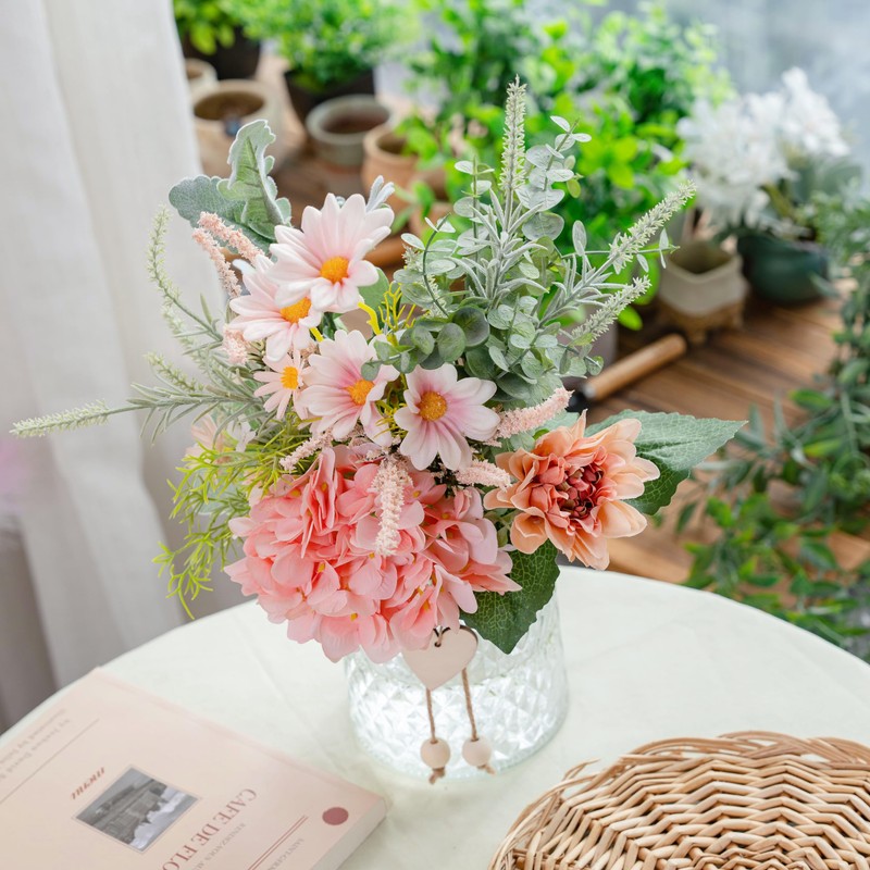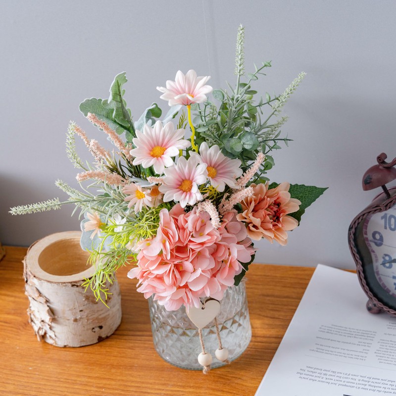 Faux Flowers with Vase, Artificial Silk Flowers in Vase, Plant Eucalyptus, Hydrangea and Gerbera Daisy, Flower Arrangement for Home Spring Decor Dining Table Centerpiece Decorations Coffee Table Decor