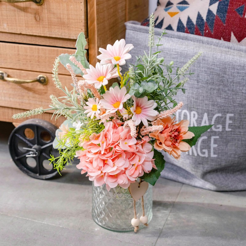 Realistic & Elegant: This bouquet features vibrant faux flowers and a mix of artificial flower and eucalyptus, all beautifully arranged in a glass vase adorned with twine. The combination of varied faux plants adds a unique touch to your farmhouse decor. The coordinated colors with the glass vase create a natural yet distinctive look, offering timeless elegance and charm to any setting.