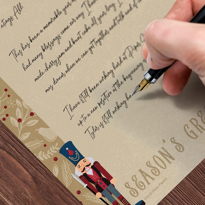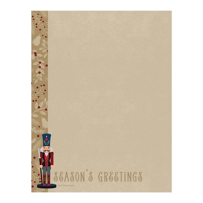 - Rustic Design: Classic nutcracker themed letterhead includes the phrase, "Season's Greetings". Faux kraft paper with an ornate holly and berry border is the perfect complement to any Christmas message or business flyer.