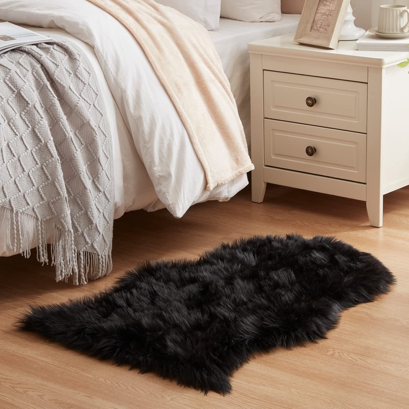 Faux Lambskin fleece rug, 60 x 90 cm, artificial fur, long hair, decorative sofa / bedroom rug, Black , 90 x 60 cm