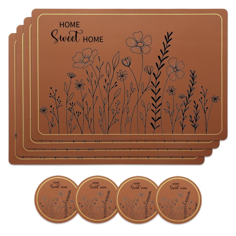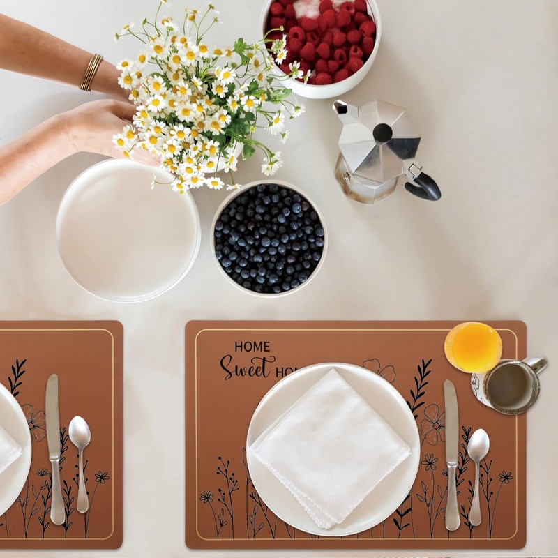 Faux Leather Placemats Set of 4 for Kitchen Table, Wildflower Place Mats with Coasters Waterproof Non-Slip Table Mats 18"×12" Brown