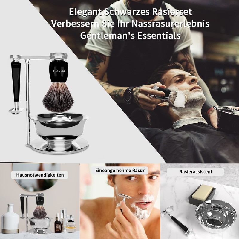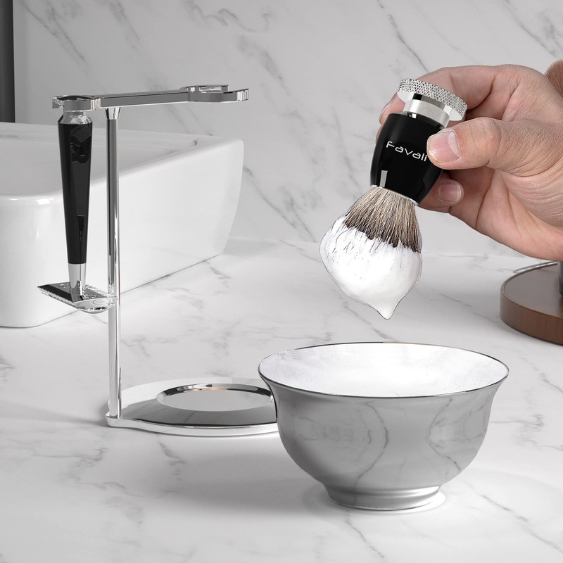 - Perfect gift shaving set for men: Favali classic shaving set contains: 1 x imitation badger brush, 1 x men's razor with 10 blades, 1 x razor stand, 1 x stainless steel razor tray, 1 x storage bag. These shaving essentials ensure a cleaner and smoother shave, reduce scratches and irritation. The perfect gift set for men (husbands, dads, grandpa) who love the traditional wet shave on Birthdays, Father's Day, Christmas, Men's Day.
