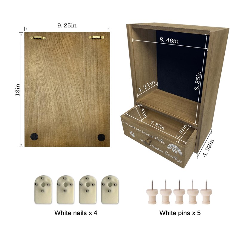 - Wall-mounted Easy Hanging: The dog keepsake box is super easy to install, all you need is to measure length between the two hooks, install the nails with a hammer, then hang the pet shadow box on. There are 4 nails and 5 pins in the package, don't worry about lack of accessories. Vintage look would match any home décor