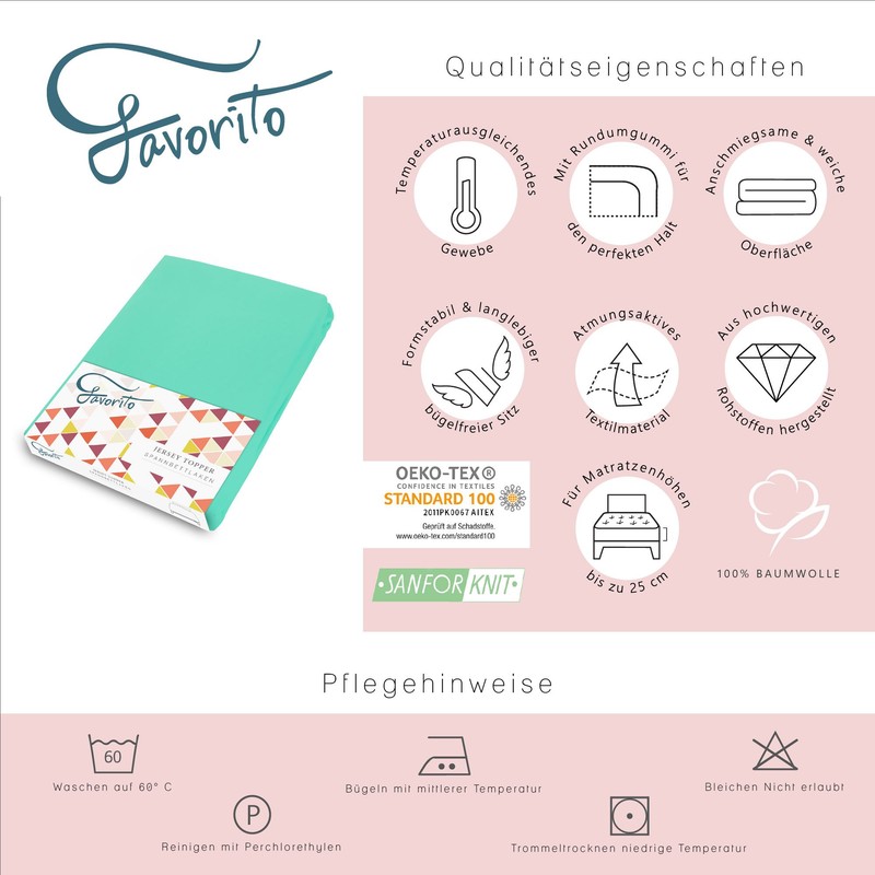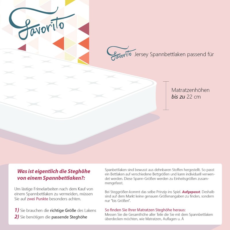 - Quality features: the Favorito fitted sheet feels very soft in the hand and is also durable. It can be placed anywhere on mattresses. The fitted sheet has a weight of 130 g/m² and has an all-round elastic. This gives you a perfect wrinkle-free fit on the mattress.