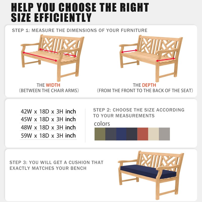 - Size Selection - Including 1 bench cushion measuring 45 W x 18 D.( The size description is only for the cushion size, accurately measuring the dimensions of your furniture's seating area in advance, make sure the cushion size fits your furniture ).