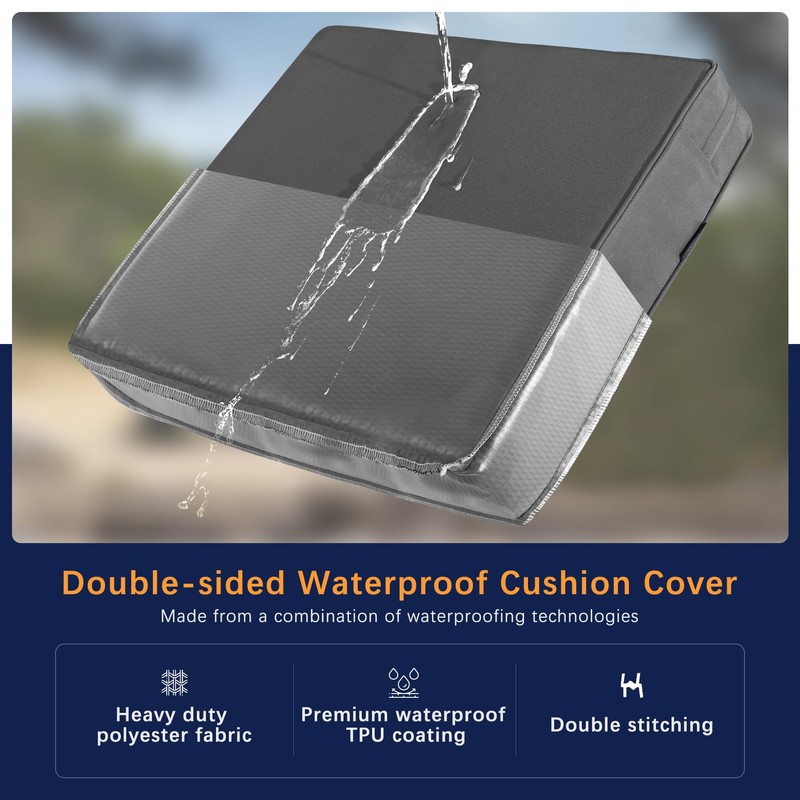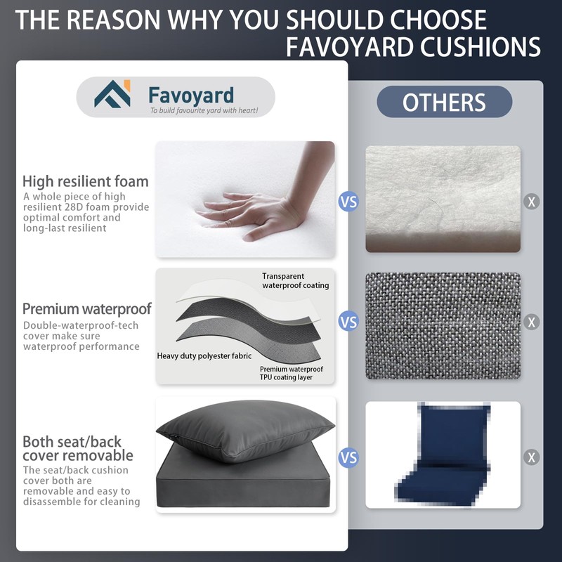- Double-Waterproof Tech Cushion Cover: Favoyard outdoor cushions for patio furniture choose 300GSM high density polyester fabric for the cover could provide excellent waterproof and dust resistance ability. In addition, there is a TPU coating on the reverse side of the fabric. Both the TPU coating and the fabric are highly waterproof. The double waterproof material provides double waterproof guarantee.