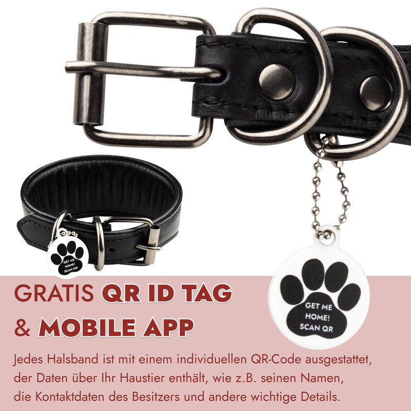 - Modern solution. Each wide leather dog collar is equipped with an ID tag with a QR code that allows you to identify the dog and minimize loss cases. You can link the tag to a mobile app and add multiple contacts. Activate the dog tag tag in the mobile app to get an online profile for your friend and register in the international animal pet identification system.