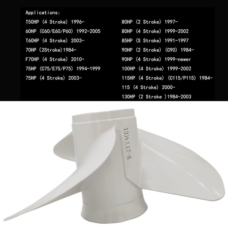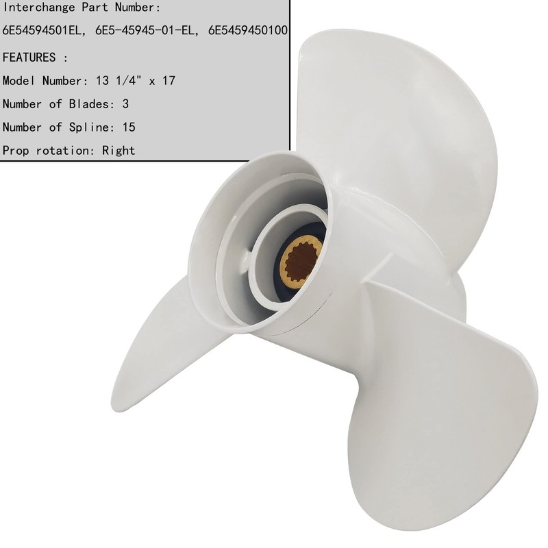 - Size & Material: 13 1/4 diameter x 17-K pitch, Rotation: right, blade: 3, right rotation,Color: White,Number of Spline:15,Material: high quality aluminum
