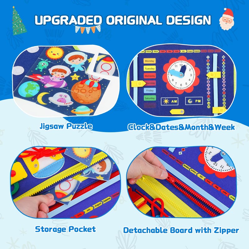 - 2023 NEW DESIGN BUSY BOARD MONTESSORI: 4 side designed with more sections and more fun. Compared to other busy board for toddlers, ours is based on the original learning section for basic life skills and adds the puzzle game, colour and shape recognition section or clock and calendar learning games.