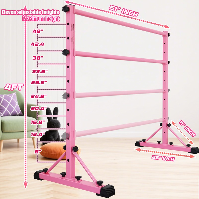 - 〖FULLY HEIGHT ADJUSTABLE AND EASY STOCK〗The Barre with 5FT in width and 4FT total height,It is fully adjustable from around 9 inches to 47.2 inches,Support for all skilled ballet training required for both kids and adults,so it is a bar can grow up with you.After finish training,You can stock the barre against the wall to save space.
