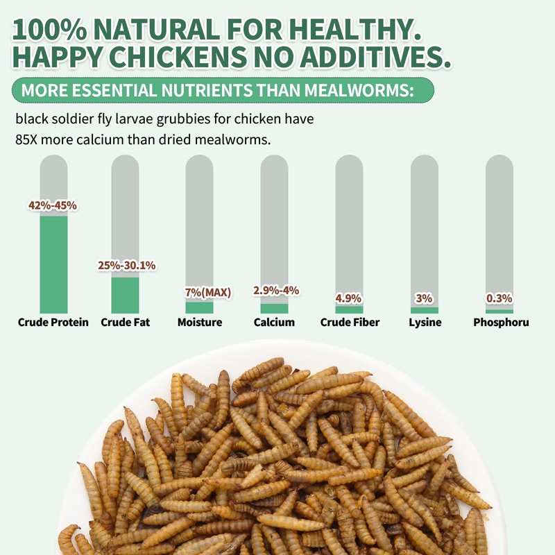 - Black Soldier Fly Larvae is rich in calcium than meal worms, more calcium and protein, this high protein treats allows your chickens to eat healthier, lay bigger eggs and produce more, are superior snacks for hens,bird seed