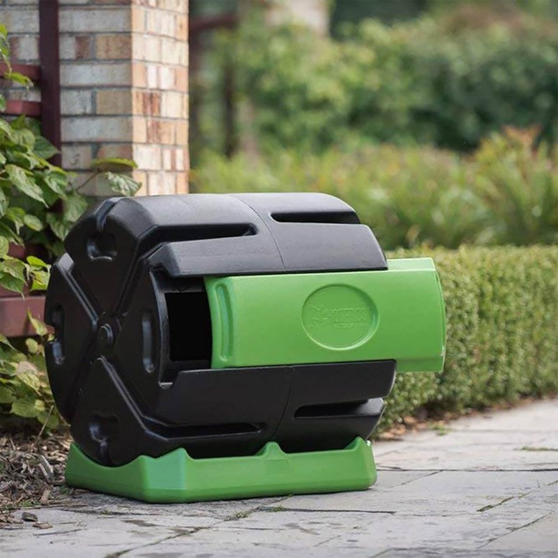 This unique rolling composter's space efficient design allows you to efficiently convert your kitchen and yard waste into rich soil enhancing compost. Just load it up, close the sliding door and use the convenient built in hand holds to give it a turn every couple days and see how it produces finished compost in weeks. Also you can conveniently roll the composter to your garden to dump the finished compost or move the composter to a different location within your yard. Help divert waste from landfill or costly processing and turn your own organic waste into compost in your own backyard.