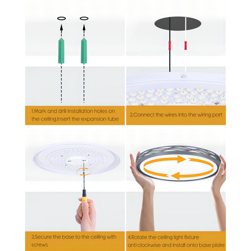 - Easy Installation: Only 4 easy steps to install the flush mount ceiling light.① Mark and drill installation holes on the ceiling. Insert the expansion tube. ② Pick up the led ceiling light, and connect the two wires. ③ Secure the base to the ceiling with screws. ④ Rotate the ceiling light fixture anti-clockwise and install onto base plate. Simple and safe. The installation of the led ceiling lamp can be done in a few minutes. (All accessories needed and instructions are included in the package)