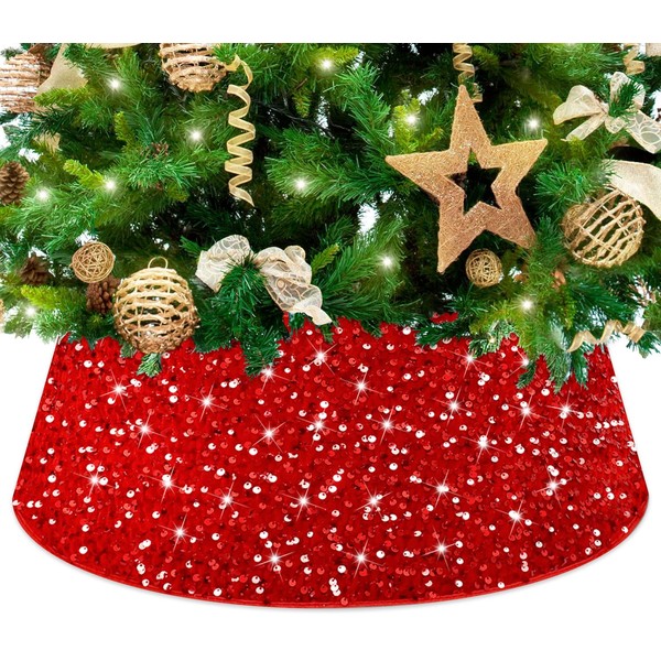 - đăPremium Material - Sequin Christmas Tree SkirtăMade from high-density sequin velvet fabric and thick non-woven fabric, Christmas tree stand collar is designed to last, providing enduring beauty and sparkle year after year. The Sequins of red christmas tree skirt catch and reflect the twinkling lights from the tree, creating a captivating visual effect.