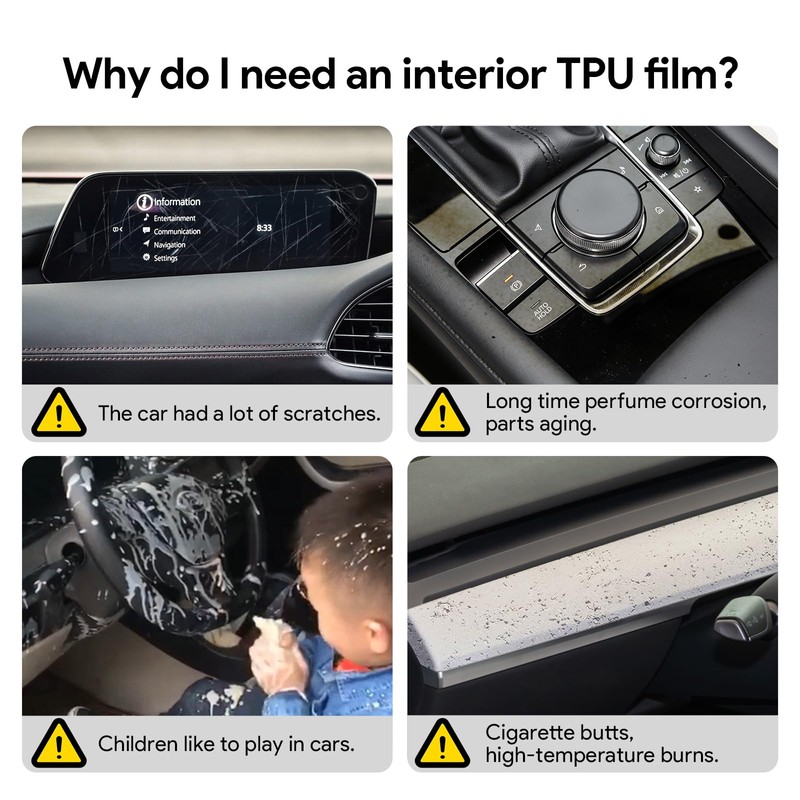 - (High Quality TPU Material) Made with TPU protective film that has good transparency and durability. Heat self-healing, scratch resistant, virtually no sticky residue, good elasticity and transparency. The transparent interior protective film will protect your interior without altering the original design of your vehicle, and will not damage the original vehicle