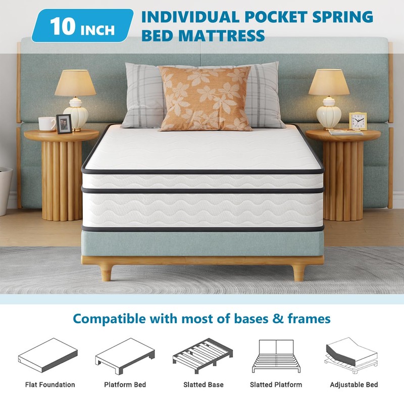 - Pressure Relief:Our hybrid mattress constructed by hundreds of individual pocketed spring coils which offers you with enough support from head to toe,you can let go of your day's fatigue and sleep comfortably with any sleeping positions