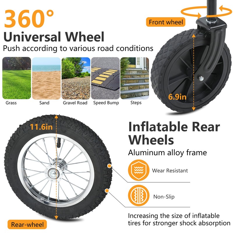 - 360 Degree Universal Wheel: With its 360-degree rotating front tire, our dog bike trailer offers unmatched maneuverability. This function makes it simple and effortless to navigate around corners and through confined spaces, making bicycling or walking a hassle-free experience.dog stroller pet stroller dog bike trailer