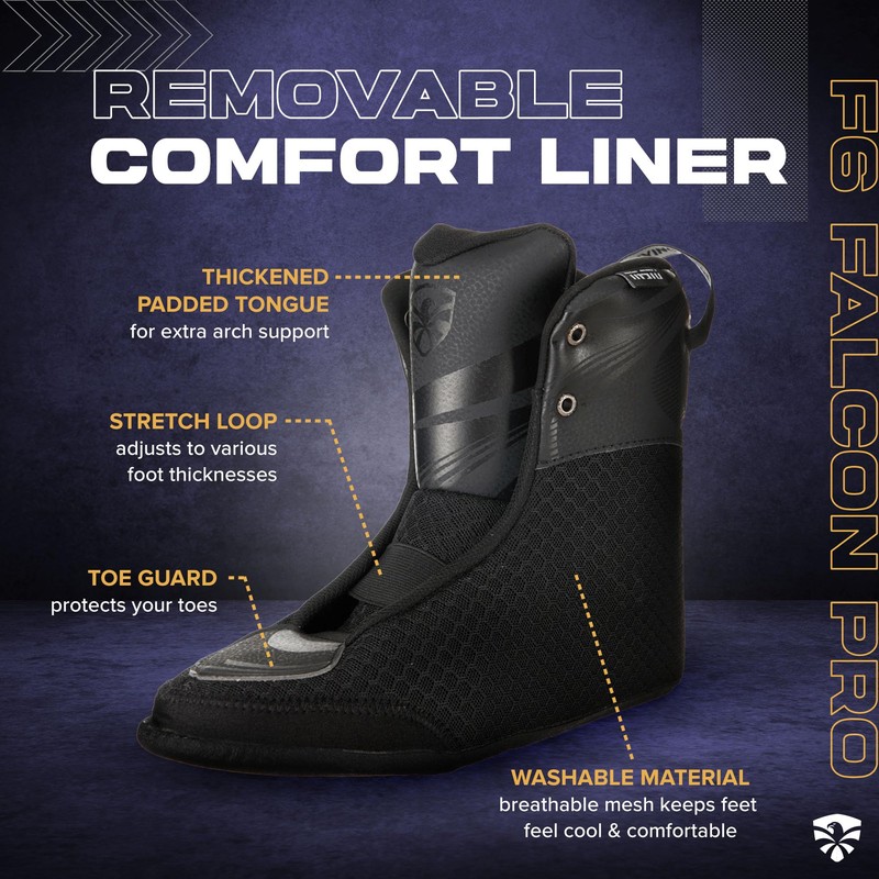The Flying Eagle F6 Falcon Pro urban inline skate features a high impact hard-boot shell with replaceable side protector combined with a highly supportive cuff, that delivers great ankle support and precise forward flex. The ultra-cushioned Eclipse liner ensures ultimate comfort, breathability, and support with lacing all to the top. The setup is rounded out with high-quality CNC extruded aluminum frames with the option to rocker the first and last wheels for slalom, 80mm Super High Rebound comfort PU wheels, and ABEC-9 pro bearings.