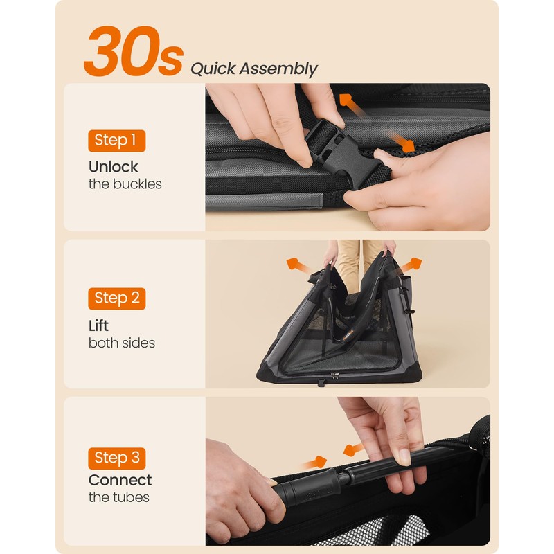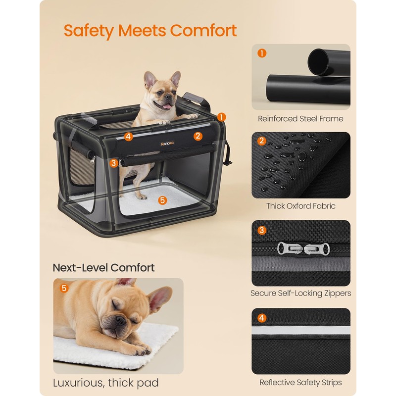- 【STURDY & SAFE】Built with a robust steel frame and scratch- and tear-resistant Oxford fabric, the soft dog crate is designed for durability. Self-locking zippers ensure pets can't open it from the inside, and reflective strips add extra safety