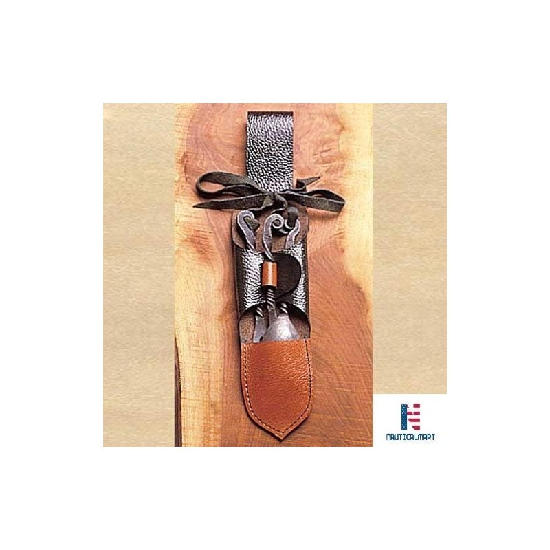 Finally, feasting utensils for the re-enactor on the go! Our knife, fork and spoon set fit neatly in a tie-fold, open belt leather pouch for a great combo. Easy to take along to the faire, a picnic, camp out or wherever you want to be able to eat out! The handle for each hand-forged piece has the traditional blacksmiths twist and the knife is capable of holding an edge. Each piece is approximately 8" long overall. This set is slightly heavier than our other feasting utensil set). Leather pouch not sold separately. Please clean before use; these have been heated treated and oil quenched. To minimize rusting keep oiled.