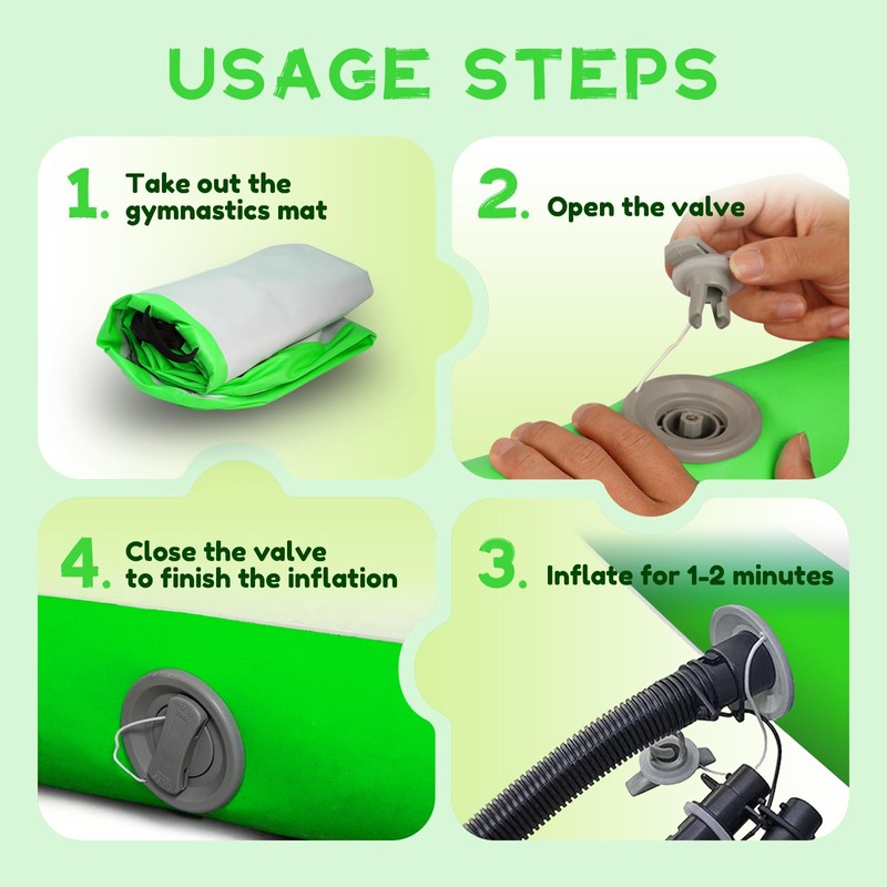 - 【Quality Material】Our Inflatable Gymnastics Mats are made of high-density PVC for comfort and malleability. All seams are reinforced for air tightness and durability.