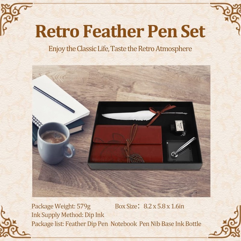 This is a stationery gift box that consists of a notebook, a pen holder and an ink bottle and meets your diverse writing requirements. Made of natural feathers, comfortable to hold. Elegant, antique and unique, perfect gifts for your friends, family members and teachers.