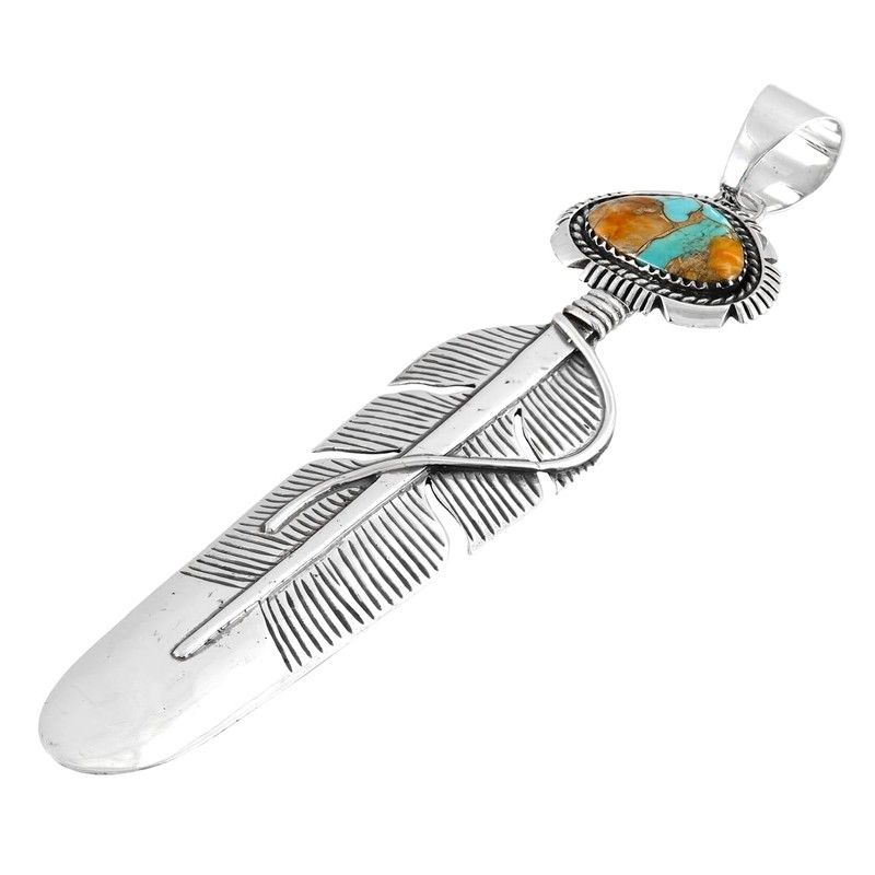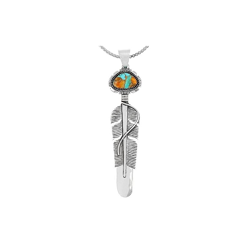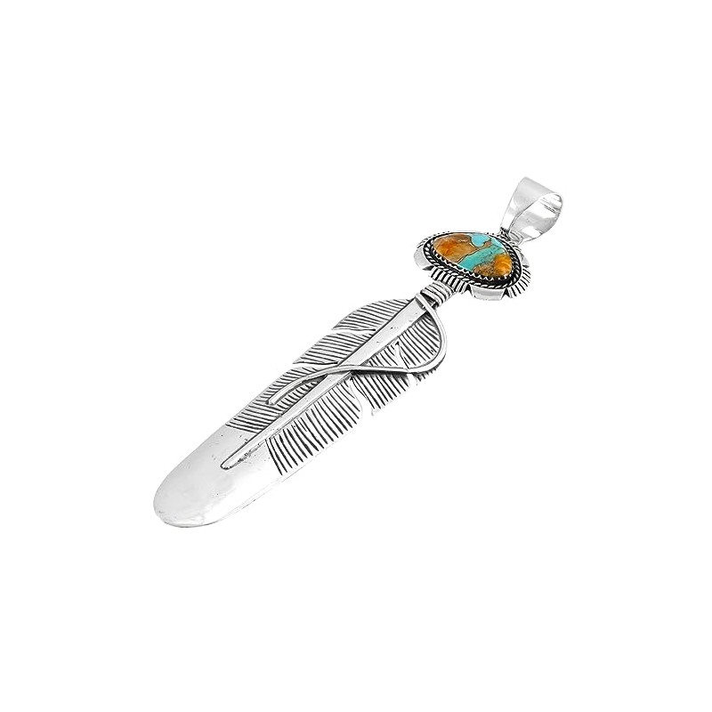 Feather Spiny Turquoise Necklace 925 Sterling Silver Pendant & 20" Chain (LARGE-Spiny Turquoise)